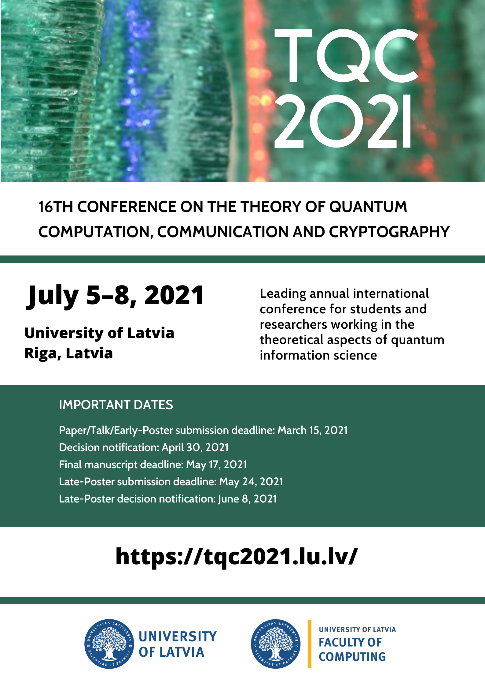 TQC 2021 will take place in Riga, Latvia from July 5-8. For more information, see: