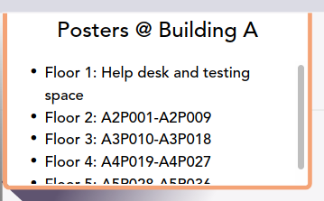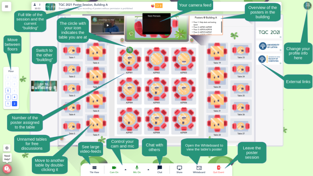 The remaining floors are designated for poster presentations. Each of those floors has nine tables designated for poster presentations and labelled accordingly (e.g., A3P024 for poster #024, which will be situated on the 3rd floor of the building “A”). At most eight people at a time (seven visitors and one presenter) can be at one table. In addition, a few unnamed tables will be available on each floor, which can be used for private (video-) conversations between participants.