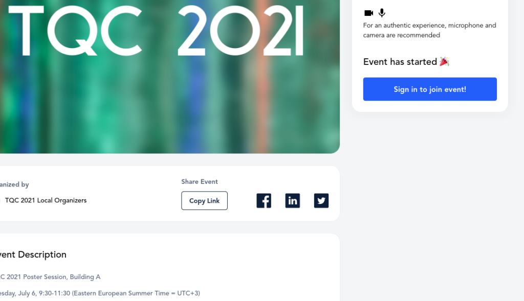 The Poster session for TQC 2021 will be held using the remote conferencing platform Remo, which mimics an in-person event. Each poster will be assigned a “table” (i.e., a group video chat room with a virtual whiteboard) where presenters will upload their poster in the PDF format. The participants will be able to interact with poster presenters using text chat, video call or the whiteboard. Participants of the discussion can also share their screen to help the discussion. The distribution of posters across the “buildings” and “floors” (see Poster session schedule/floors) is available online.